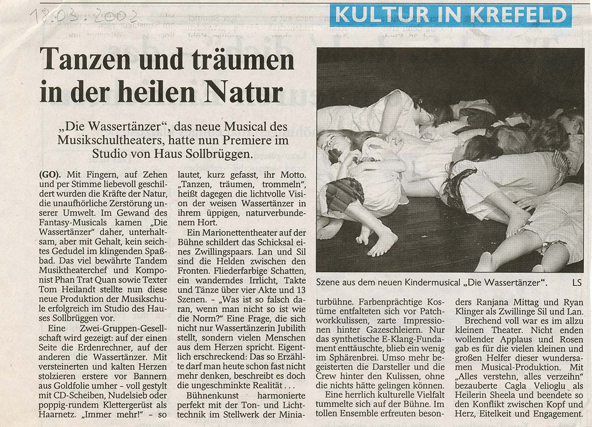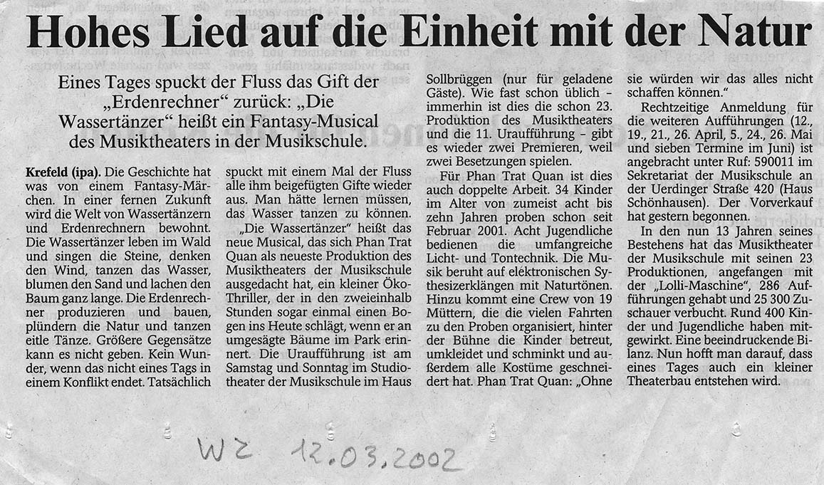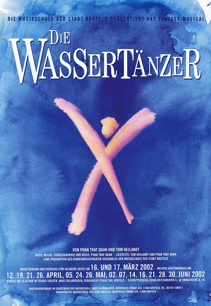 KURZBESCHREIBUNG - PERSONEN - INSTRUMENTENBESETZUNG - INHALT LIBRETTO GESANG MIT KLAVIERBEGLEITUNG PLAKATE UND PREMIEREN-REZENSIONEN Originalplakat 2002 Originalplakat 2010 RP-Krefeld 18.03.2002 WZ-Krefeld 12.03.2002 RP-Krefeld 27.09.2010 WZ-Krefeld 20.09.2010 LIVE VIDEOAUFNAHMEN IM STUDIOTHEATER Studiotheater 2002, A-Besetzung Studiotheater 2002, B-Besetzung Studiotheater 2010, A-Besetzung Studiotheater 2010, B-Besetzung ALLE LIEDER ALS MP3 Wassertanz Ballade der Zwillinge Abschied Denkwerkstatt Wir lachen lang Aber nicht mit uns Begegnung Irrlicht Wir daancen Wir leben Die Nacht der Angst Quartett Überfall Das Wasser Alles versteh'n Holzglocken Final BILDERGALLERIE