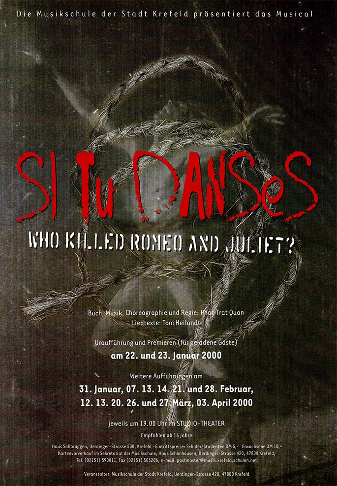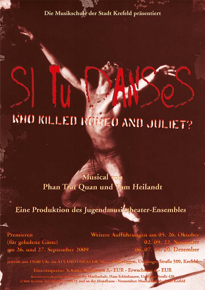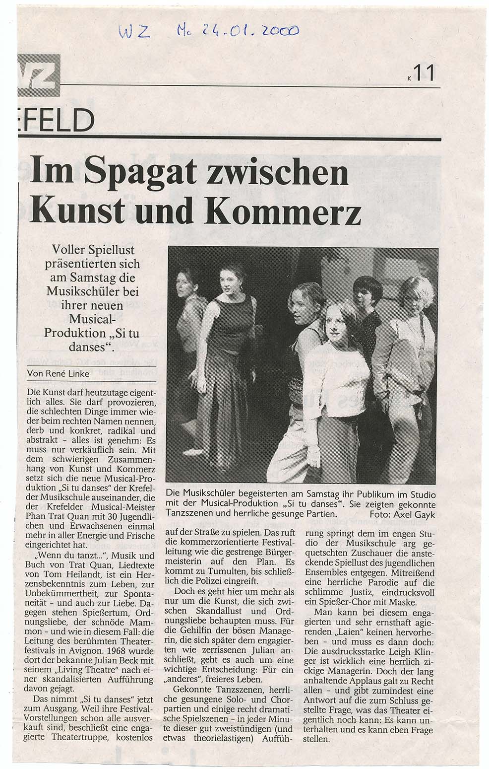 KURZBESCHREIBUNG - PERSONEN - INSTRUMENTENBESETZUNG - INHALT LIBRETTO GESANG MIT KLAVIERBEGLEITUNG PLAKATE UND PREMIEREN-REZENSIONEN Originalplakat 2000 Originalplakat 2009 WZ-Krefeld 24.01.2000 RP-Krefeld 29.09.2009 ALLE LIEDER ALS MP3 Si tu danses 1 Was ich bin Was ist Kunst? Hiverdure So viel mehr Recherche Celebration Les marchands de chagrin Avignon Eine Feder Festival Si tu danses 2 Verhaftung Öffentlich bekleidet Noire Final BILDERGALLERIE