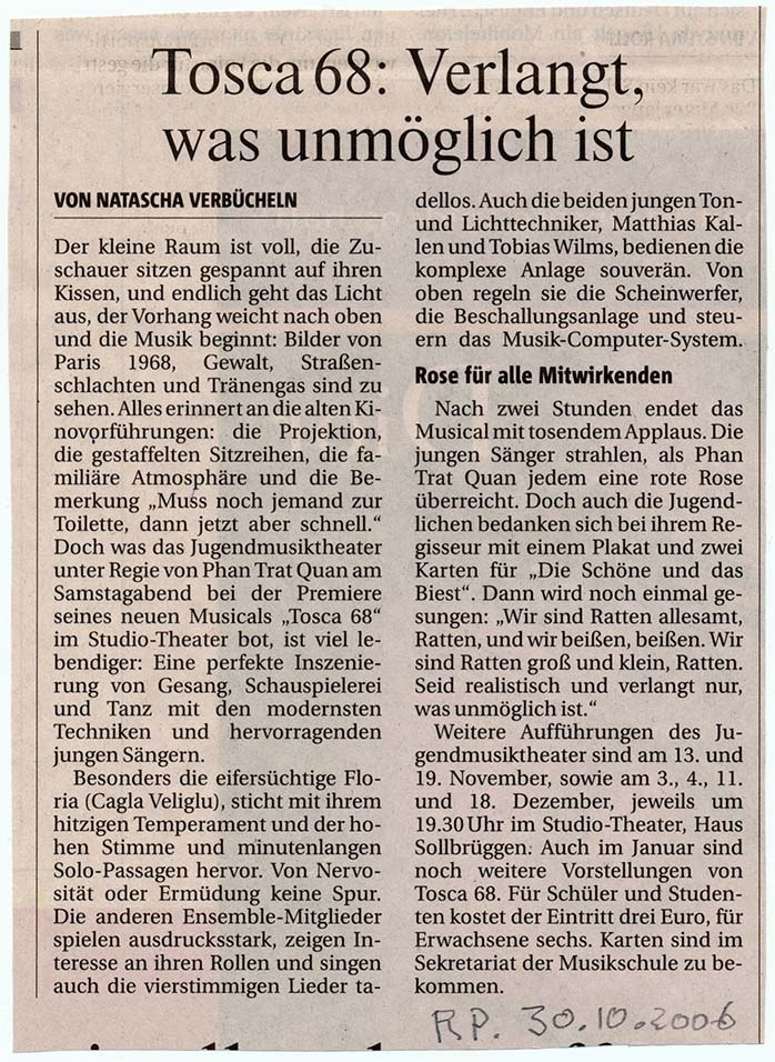 KURZBESCHREIBUNG - PERSONEN - INSTRUMENTENBESETZUNG - INHALT LIBRETTO GESANGSSTIMMEN PLAKATE UND PREMIEREN-REZENSIONEN Originalplakat 1996 Originalplakat 2006 WZ-Krefeld 01.10.1996 RP-Krefeld 30.10.2006 WZ-Krefeld 30.10.2006 LIVE VIDEOAUFNAHMEN IM STUDIOTHEATER Studiotheater 1996, A-Besetzung Studiotheater 1996, B-Besetzung Studiotheater 2007, A-Besetzung Studiotheater 2007, B-Besetzung ALLE LIEDER ALS MP3 Prolog Église In meinen Händen Flüchtlinge Ich konnte nicht anders Liebe ist Traum Komm Picard Freaks Castle Mamba Feuer Mission Eifersucht Besuch Folter Fabrik Lullaby Gottes Wind Triste Final Nachklang BILDERGALLERIE